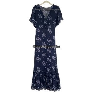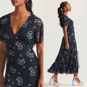 Romance found in our new Kover Dress. This 30’s-inspired slip dress features an elegant bow print on a viscose fabric. A deep v neckline with light flutter sleeves falls to a shaped waist seam that flows to a beautiful flounce skirt. This figure skimming maxi is an easy day-to-night piece with lining at the front bodice and a snap on the side for functionality. 100% Viscose. Approx. 55" in length.