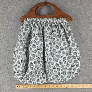 Romantic and rare LoveShackFancy McKenna Grand Bag in cotton-linen blend with vintage-inspired black and white floral print. Features a gathered top and sculptural solid wood handle with cut-out grip. Lightweight and roomy for everyday use, gifting, or cottagecore styling. Signature LoveShackFancy aesthetic.