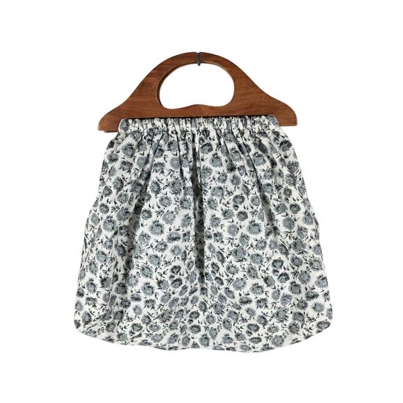 Romantic and rare LoveShackFancy McKenna Grand Bag in cotton-linen blend with vintage-inspired black and white floral print. Features a gathered top and sculptural solid wood handle with cut-out grip. Lightweight and roomy for everyday use, gifting, or cottagecore styling. Signature LoveShackFancy aesthetic.
