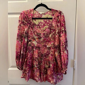 LoveShackFancy Willis Metallic Mini Dress in Pre-Dawn Sky. Features v-neckline, long blouson sleeves with button cuffs, abstract floral print with metallic accents, shirred details, tiered skirt, wide fixed waistband, hidden side zip closure, A-line silhouette, mini length, and lined. Shell: 75% Viscose, 25% Metallic. Lining: 100% Polyester. Excellent condition, no flaws.