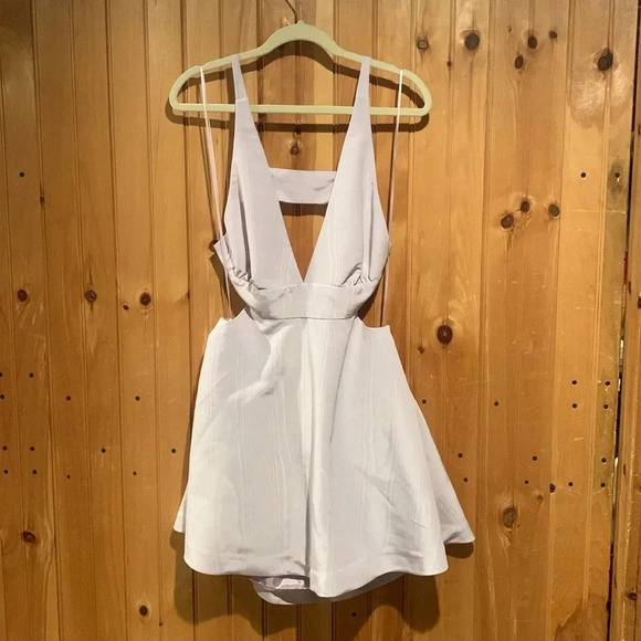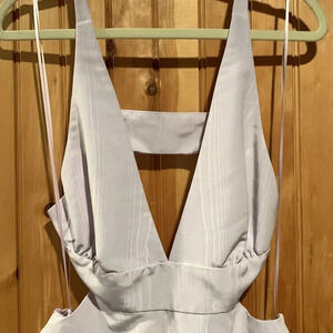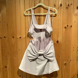 LoveShackFancy till bow pastel lavendar open back mini dress. Adjustable straps, side zippers. No callouts to note. Stock photos added for reference from the website.