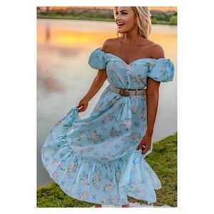 NEW with tags LOVE SHACK FANCY x Target Estelle Puff Sleeve Off the Shoulder Blue Floral Midi Dress Blogger Favorite