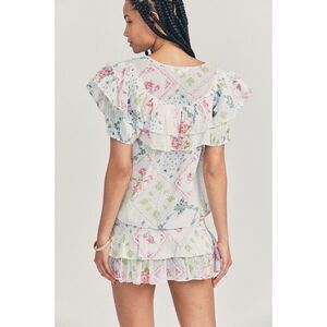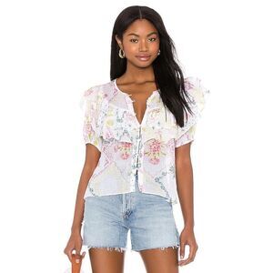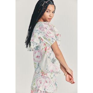 Our Amora Top arrives in 100% cotton with a mixed handkerchief floral print. This breezy blouse has a scoop neck, interior buttons and loops that descend at center front, a double ruffled yoke trim and classic puffed sleeves with encased elastic at opening. Make the perfect set this summer with our Sicily Skirt. Shown here in Magic Light.