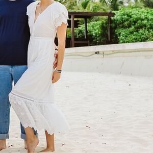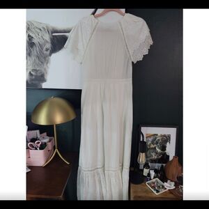 Cottage core dress with eyelets and lace. Flutter sleeves and a scalloped style hem make this a perfect choice for summer evening dresses. Picnics, date nights, Easter, Labor Day, all the summer events are perfect for this midi dress.