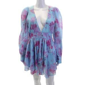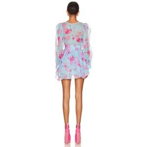 Step out in our Varsha Dress. Whether it be day or night, this mini features a sweet, floral print over a sky blue palette. This piece is a breeze with exaggerated, long sleeves, a deep v-neckline and ruffles beneath the bodice flowing to an asymmetrical hem Long sleeve. Deep v neckline. Side zip. True to size. NWT. Finished with layered skirt, this gorgeous and sexy minidress is made of lightweight cotton gauze with a floral print. Self: 80% cotton, 20% nylon