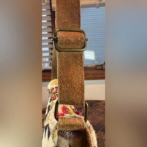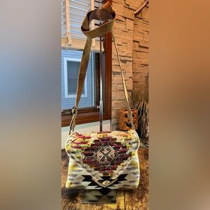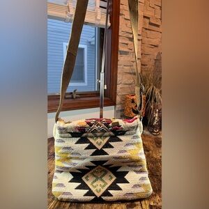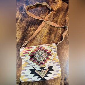 Ladies beaded Boho purse. Flap over snap closure. 1- zippered interior pocket. 1- slide in pocket. Fully lined. Woven material. Fully adjustable suede strap. Aztec look. The exterior is beaded and has some loose beads, there are beads inside the bag. Good, used cond.