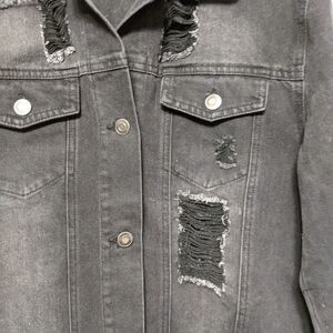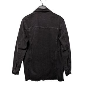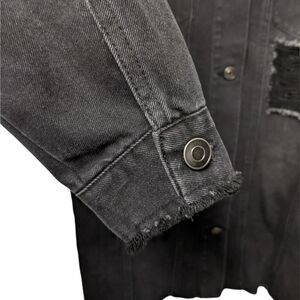 Oversized fit. Faded black. Manufactured distressing. Raw Hem.
