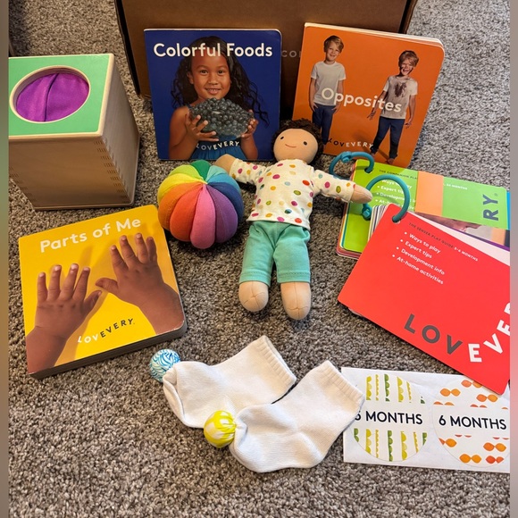 Toys from various kits. The tissue box is missing the tissues but any fabric can be used to pull through. All items in good to like new condition. Selling all together cannot separate. I have other Lovevery kits/toys in my closet and will be posting more soon. *price firm, thank you for understanding :)