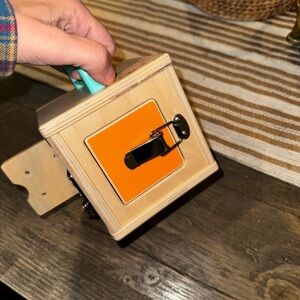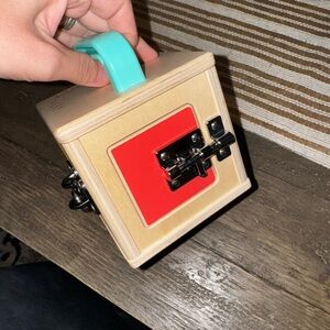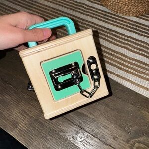LOVEVERY Interactive Wooden Play Cube with Handle Toddler Toy. Very gently used. Unlock locks.