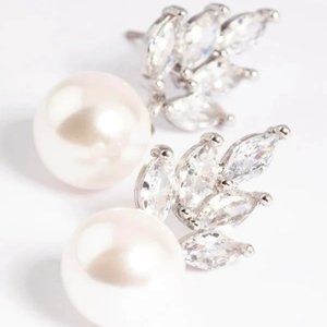 LOVISA Glamorous Silver Leaf Clear Cubic Zirconia/Pearl Drop Earrings**NEW!