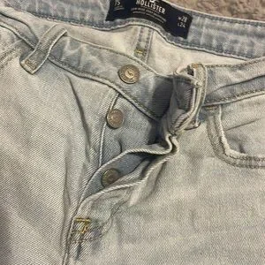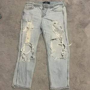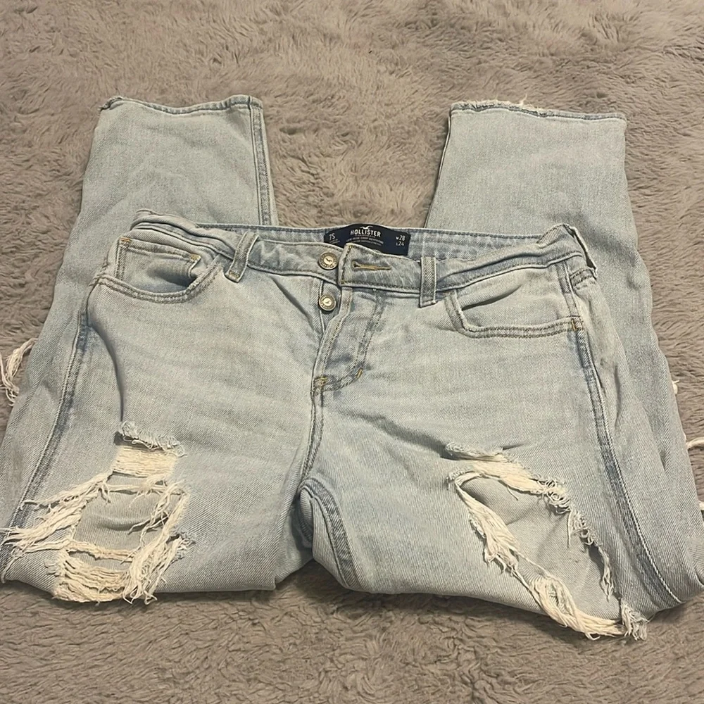 These are very ripped, light colored, low rise jeans from hollister! cute and comfy and size 7S (short). they also have some stretch to them