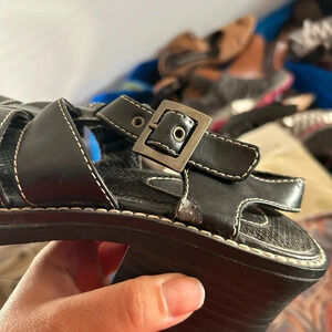 New without tags never worn. These have a minor flaw - there is a tiny area where the finish has come off (pictured). Bottoms are brand new. WOMENS size 7.5. These are the cutest chunky y2k sandals.