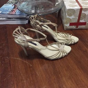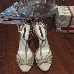 Ralph Lauren Collection t-strap, caged heel, platinum lame Napa leather. Comes with original box (no shoe bag). Good condition. Great for weddings or summer parties!