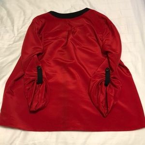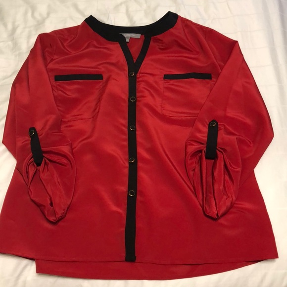 Silky red button up shirt. More in the dressy side. Cuffed sleeves. Black and gold accents. Worn a few times. Size PL.