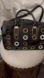 REBECCA MINKOFF SIGNATURE INTERIOR LINING; TWO INTERIOR POCKETS; ONE INTERIOR LARGE ZIPPER POCKET. A BLACK LEATHER NAME PLATE.