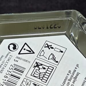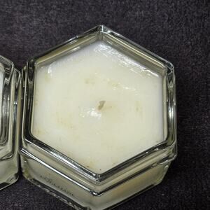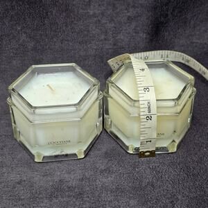 L'Occitane En Provence Scented Candle 3.5 oz Glass Jar Set of 2. Brand new, never burned, missing lids with the tops of the candle having some dust inside as shown.