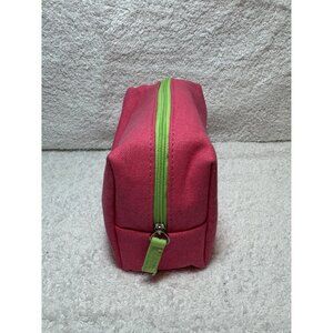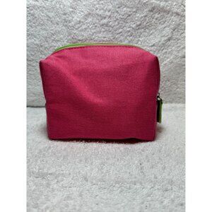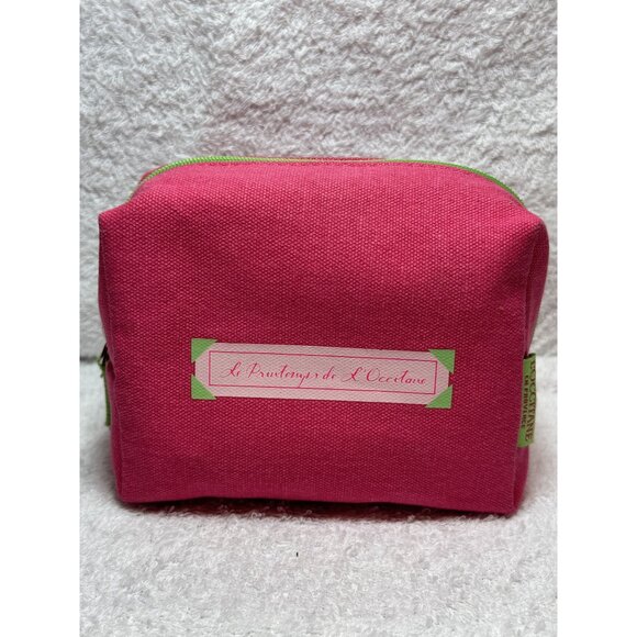 Stylish and durable, this pink canvas cosmetic bag from L'Occitane is ideal for organizing makeup and toiletries, featuring a secure green zipper closure.