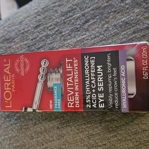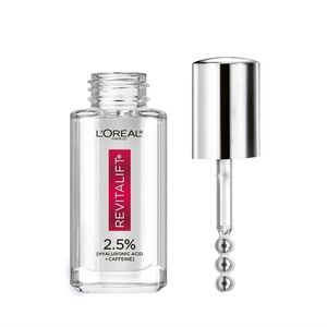 `L'Oreal Paris Revitalift Caffeine Eye Serum, Replumps, 0.67 fl oZ •Formulated with 1.5% Pure Hyaluronic Acid to enhance skin's moisture retention and 1% Pure Caffeine to re-energize skin and reduce the appearance of dark circles and puffiness •Non-greasy formula that leaves skin feeling moisturized, smoother, and firmer. Triple Roller applicator with three cooling, stainless steel balls that bend to provide a full eye contour massage, leaving eyes looking refreshed and well-rested. `Dermatologist-validated formula, ophthalmologist-tested. fragrance-free, paraben-free, allergy-tested, and contact lens suitable. •Suitable for all skin types