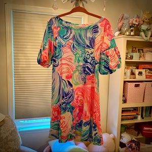 Adorable girls Lilly Pulitzer dress worn one time πΈ SZ Small (4-5). Print is called multi beach please π