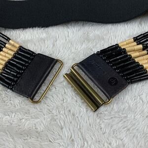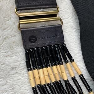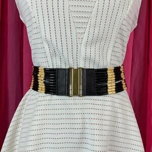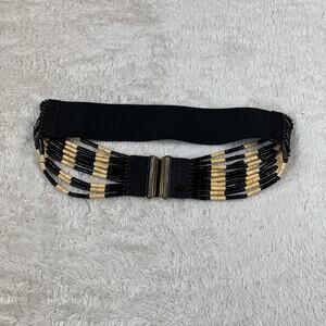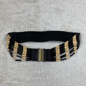 Attractive tan and black beadwork with gold hardware closure. Back is elastic and offers ample stretch. Was a bit too big for my waist.