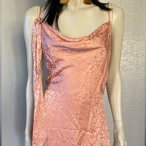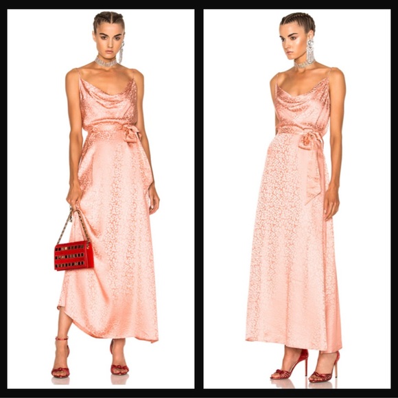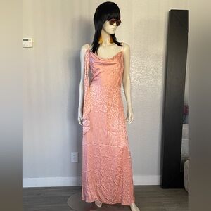 Pink silk maxi dress with cowl neckline, tie waist, and flared skirt #partydress