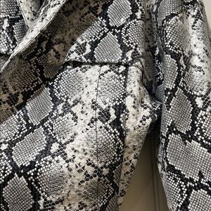 Stylish snake print bomber jacket by LPA. Features bold black and white pattern. Perfect for a trendy look.