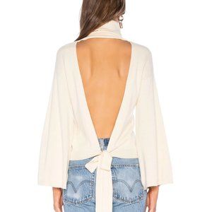 70% nylon, 30% viscose. Hand wash cold. Knit fabric. Foldover neckline. Flared sleeves. Open back with tie closure.