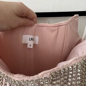 NWT. Light pink velvet with rhinestone fringe trim. Cute button details at the back. From Revolve.