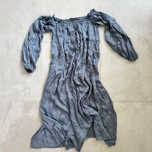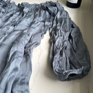 Chic off-shoulder top with ruffle details. Elegant gray color.