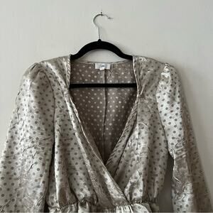In good preowned condition. Metallic fabric. Cute wrap-effect front. Flattering fit. Sold at Revolve. Silvery/gold metallic.