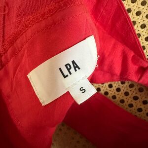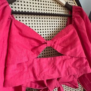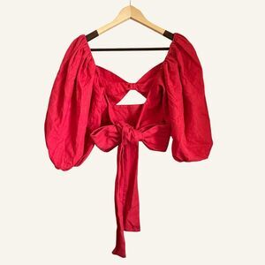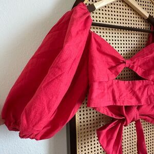 LPA Puff Sleeve Linen Blend Crop Top Self Tie Bow Bold Red Size S