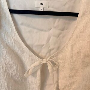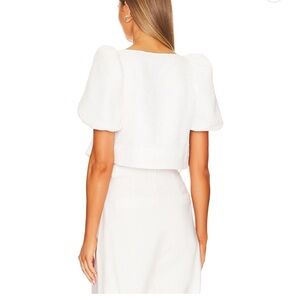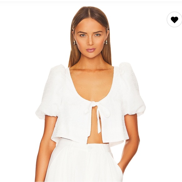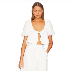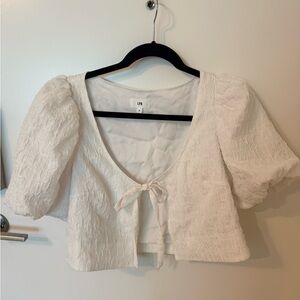 Cropped tie-front top with short puff sleeves. Scoop neckline and open front tie closure. Lightweight textured fabric for breezy wear. Classic white shade for versatile styling.