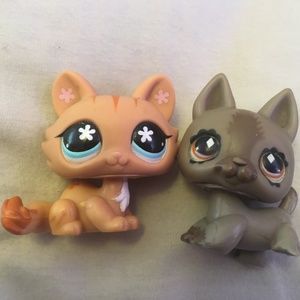 Two used LPS. The cat is from 2008 and the dog is from 2007. Neither of them have a magnet. The dog is missing half of one of its back legs but it just adds character to it :) There’s a little bit of faded paint on the dog and both of them have some scuffs.