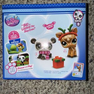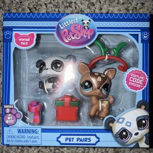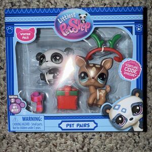 The LPS Littlest Pet Shop Hasbro 2024 Winter Pals pet pairs G7 #1 #117 features a panda and deer duo from the beloved Littlest Pet Shop character family. This toy set is recommended for ages 4 and up and was manufactured by Hasbro in China for the year 2024. The item is new and sealed, making it a perfect addition to any Littlest Pet Shop collection for young fans of these adorable animal characters.