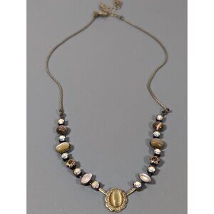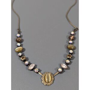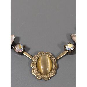 LR Antiqued Gold Tone Cats Eye Cabochon Rhinestone Tennis Chain Necklace Elegant