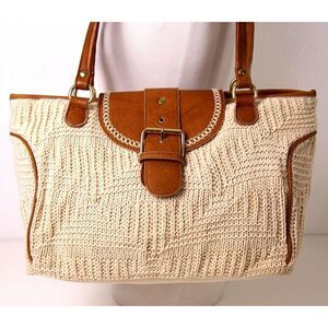 LARGE BONFANTI ITALY NATURAL KNIT COTTON BROWN GENUINE LEATHER SHOULDER BAG HANDBAG HOBO