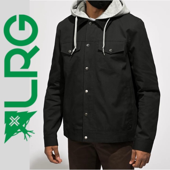 NWOT LRG Black Hooded Jean Jacket. Size Small. Black With Grey Hood. Full Button Closure. Grey Hood. Adjustable Hem And Cuff. Front And Back Yokes. Two Chest Patch Pockets. Two Side Welt Pocket One Snap Closure Patch Pocket With Woven Label. Two Hidden Interior Pockets. Missing Drawstrings. 98% Cotton 2% Spandex