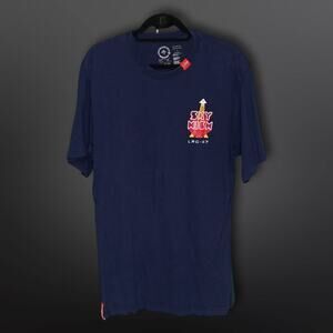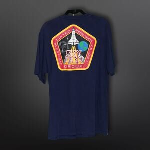 Check out this awesome blue LRG (Lifted Research Group) t-shirt, perfect for any fan of space or unique streetwear! This men's size large tee features eye-catching graphics on both the front (upper right) and back (center), drawing inspiration from NASA and the mysteries of outer space.