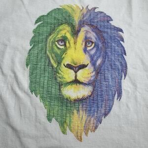 Crisp white tee from Lifted Research Group (LRG) featuring a bold lion head graphic in green, yellow, and blue. Classic early 2000s streetwear aesthetic with clean lines and vibrant color.