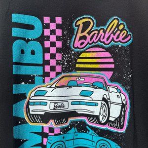 Officially licensed Barbie crew neck sweatshirt, featuring a vibrant screen print of the iconic Malibu Barbie sports car in a striking vintage 80s style.