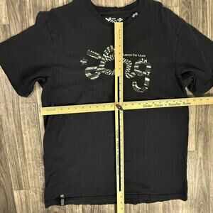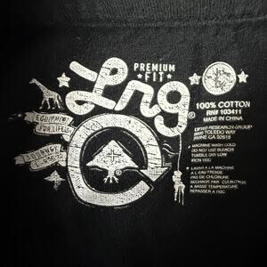Black LRG “Premium Fit” crew neck tee made from 100% cotton. Front features graphic print with “Lifted Research Group” style motifs. Interior print reads RN# 103411, made in China. Slight softening of fabric from wear, colors remain strong. No holes, stains, or repairs evident. Please check all photos for condition and details. Great everyday streetwear piece from LRG.