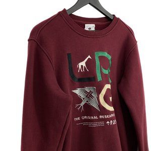 Description: Take your streetwear to new height with the Lifted Research Group (LRG) for blend of skateboarding and hip-hop. This LRG Sweatshirt has a full graphic LRG Logo in an embroidered texture with giraffe and tree above mini embroidery - The Original Research Group: "This product has been mapped out and projected and by all means necessary should be used to preserve the future." It is a maroon crewneck sweatshirt with rounded, ribbed neckline, cuffs, hemline on a long sleeve style. On the back, the Lifted Research Group logo badge is centered on the top. Skateboarding/Hip-Hop Streetwear. Style with oversized carpenter jeans or corduroys.