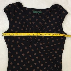 Lauren Ralph Lauren cap sleeve midi dress in black with brown diamond print. V-neck and empire waist. Faux wrap skirt. Flattering on and very versatile. Easy care polyester/spandex blend is also super comfortable.