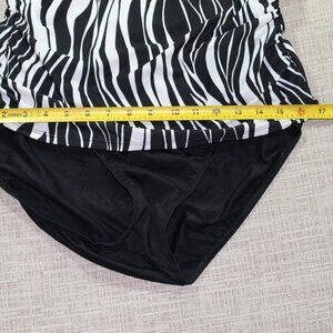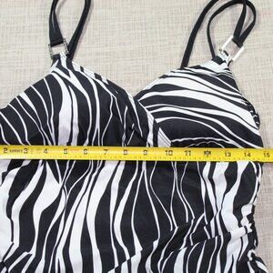 Beautiful zebra pattern with crossover bust, double spaghetti strap feed off a shiny silver embellishment giving it that upscale vibe. The tankini type top has a sheer lining underneath connecting the bottom to the top. This is the perfect modest but still sexy swimsuit that does not look like a maternity swimsuit. Excellent preowned condition - LIKE NEW - no flaws.