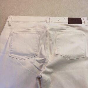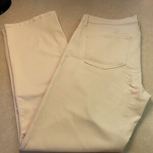 10.5” rise and 31” inseam in creamy ivory. Five pocket. Straight leg. New condition. 17” waist flat measurement.