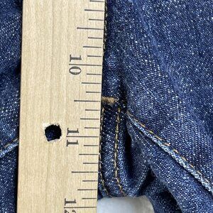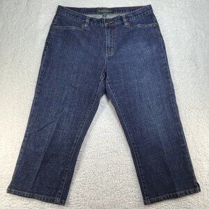 These LRL Lauren Jeans Co jeans for women are size 12, featuring a classic mid-calf length with a high rise. The jeans are blue with a dark wash, made from a cotton blend denim fabric. They have a zip and button closure, a vintage style, and are machine washable. The denim fabric is of high quality, and the brand is Ralph Lauren Jeans Co. The jeans offer a comfortable fit with a leg opening of 8.5 inches, an inseam of 21 inches and an actual waist of 33 inches. See the photos for details.