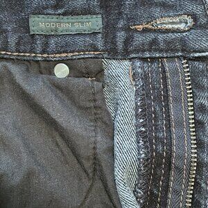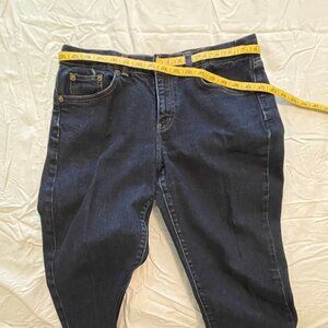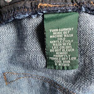 LRL Lauren Jeans Co, Ralph Lauren, Modern Slim, 5 pocket, dark blue wash, 98% cotton, 2% elastane medium weight fabric, machine wash. Measurements inseam 30, waist 32-33 inches, pants width 8 inches.