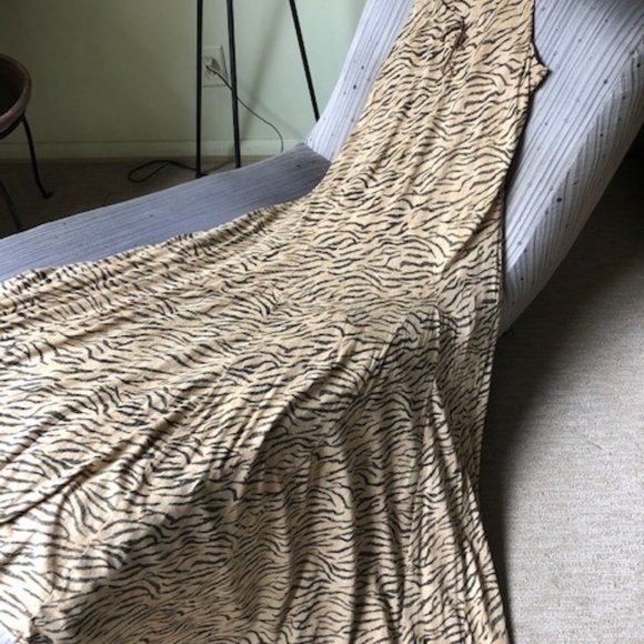 Gently worn maxi dress from the LRL Lauren Jeans line with a tan and black ikat print. 100% cotton, machine washable. Designed for a very tall woman; it's very long even on a 5'11" slender frame. Would be a bit shorter on a woman with a more voluptuous silhouette.