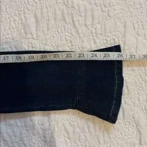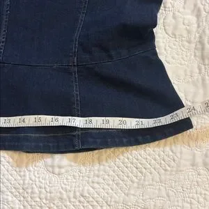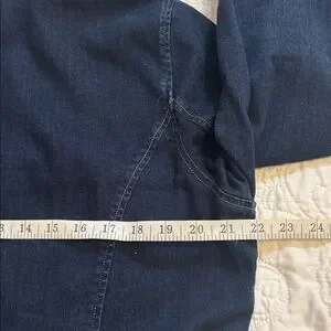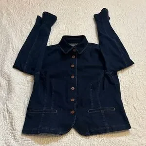 LRL Lauren Jeans Co. Ralph Lauren size 16 dark wash princess seam front button ruffle sleeves detail Jean jacket. Hip pockets (have not been opened). Cotton/poly/elastane fabric with some stretch. See photos for details. Great wardrobe staple in very good gently used condition *One Day Closet Clear Out*