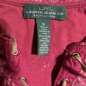 LRL Lauren Jeans Co Red Floral 3/4 Sleeve Lace Up Top Ruffle Women’s Size 1X